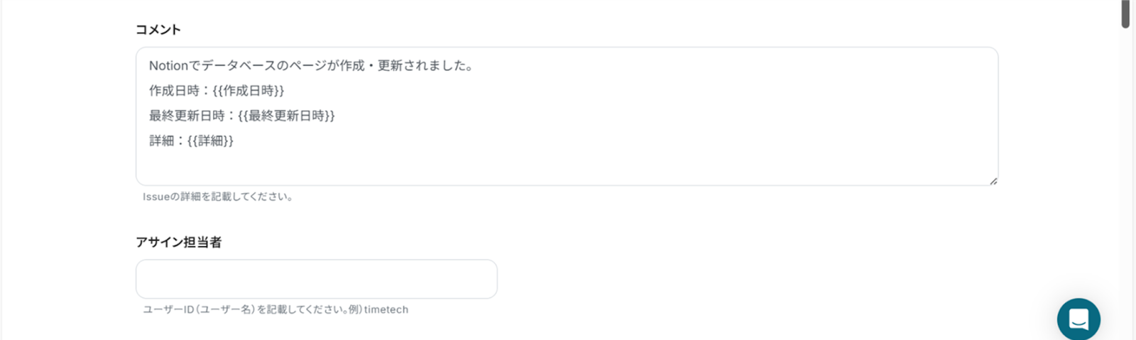 (4)下へ進み、コメントに入力した内容がGitHubに反映されます。 文中に『取得した値』を使うことで、Notionの情報を引用できます。 アサイン担当者にはユーザーIDを入力します。