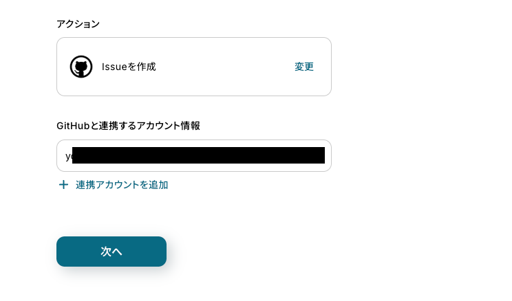 (2)GitHubの「連携アカウントとアクションを選択」画面から、GitHubと連携するアカウント情報に誤りがないかを確認し、アクションは「Issueを作成」のままで「次へ」をクリックします。