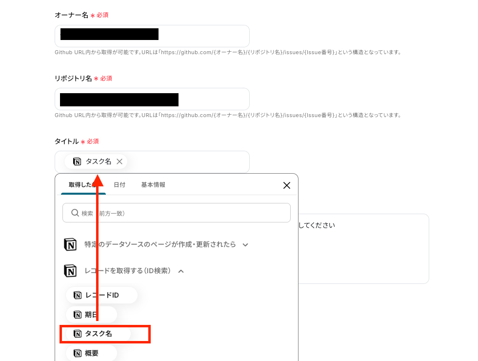 (3)「API接続設定」画面では、注釈に沿って、「オーナー名」「リポジトリ名」を入力します。 「タイトル」は、下の画像のように『取得した値』を使って入力します。