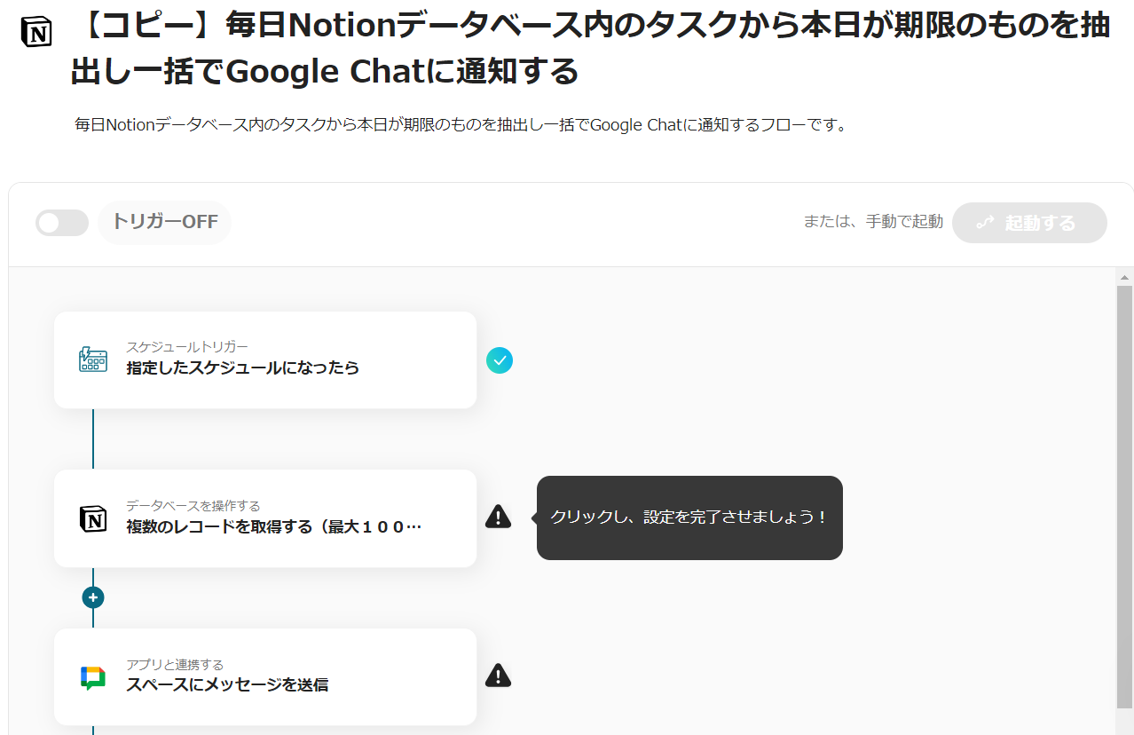毎日Notionデータベース内のタスクから本日が期限のものを抽出し一括でGoogle Chatに通知するフローです。