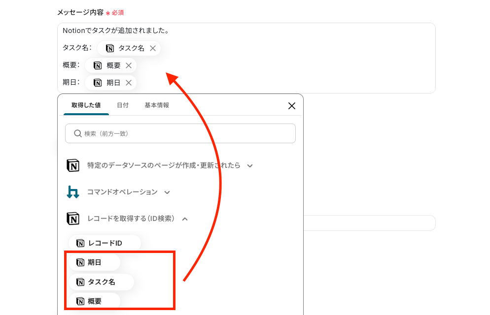 次に、「メッセージ内容」を設定していきます。 以下の画像のように取得した値を活用しながら、通知させたい内容を指定していきましょう。 固定のテキストや「:」などの記号も使って、全体を見やすく整えるのもおすすめです。