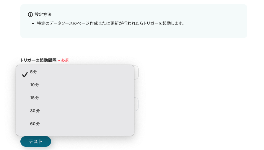 次の画面で「トリガーの起動間隔」を設定しましょう。 ※トリガーの起動タイミングは、5分、10分、15分、30分、60分のいずれかで設定できます。ご利用プラン によって、設定できるトリガーの最短間隔が違うので、その点は要チェックです。 なお、基本的にはそのプランの最短の起動間隔にしてお使いいただくことをおすすめします。