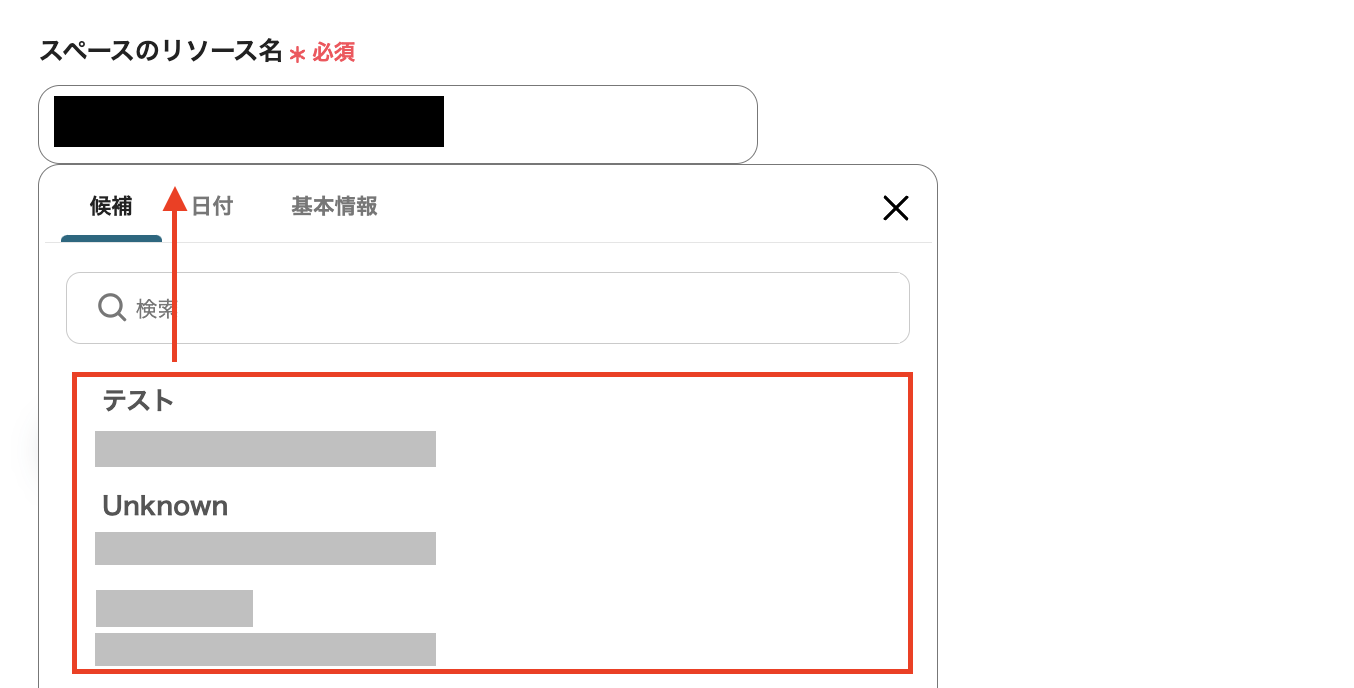 次の画面の「スペースのリソース名」は、入力バーをクリックすると連携したアカウントに基づいた内容が『候補』に表示されるので、運用に沿った情報を選択できます。