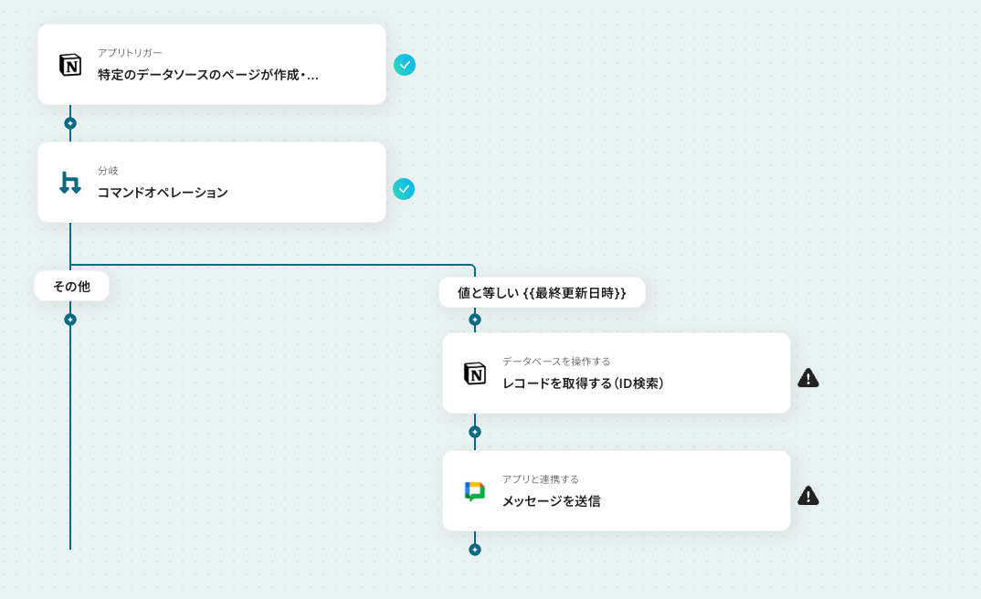 Notionのトリガー設定では、連携の対象としたいデータソースのIDを任意で設定してください 分岐機能では、Notionから取得したページのプロパティ(例:ステータスが「会議予定」の場合など)をもとに、ワークフローを起動する条件を自由にカスタマイズできます ■注意事項