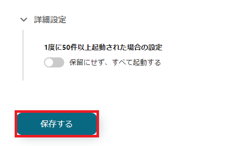 また、画面下部までスクロールすると詳細設定の項目があり、同時に50件以上起動された場合の処理方法を指定することができます。