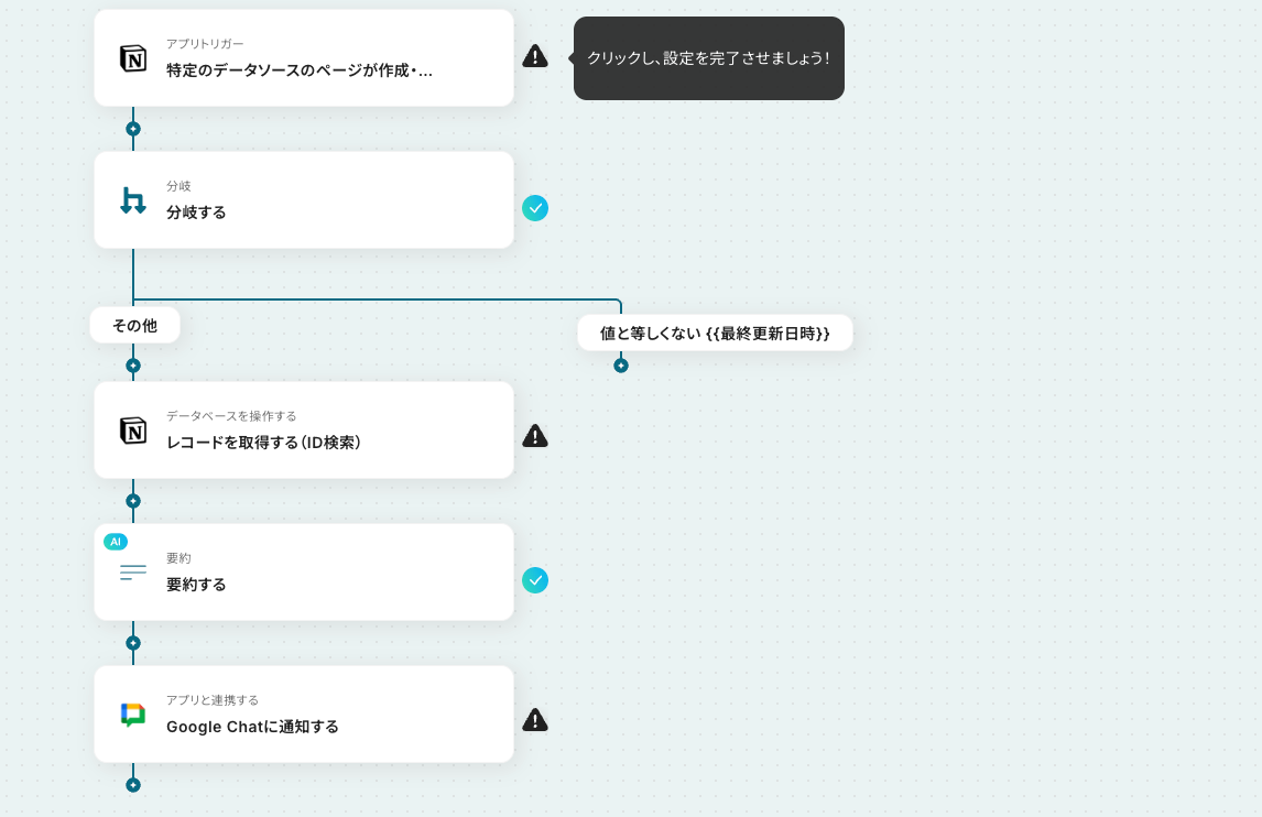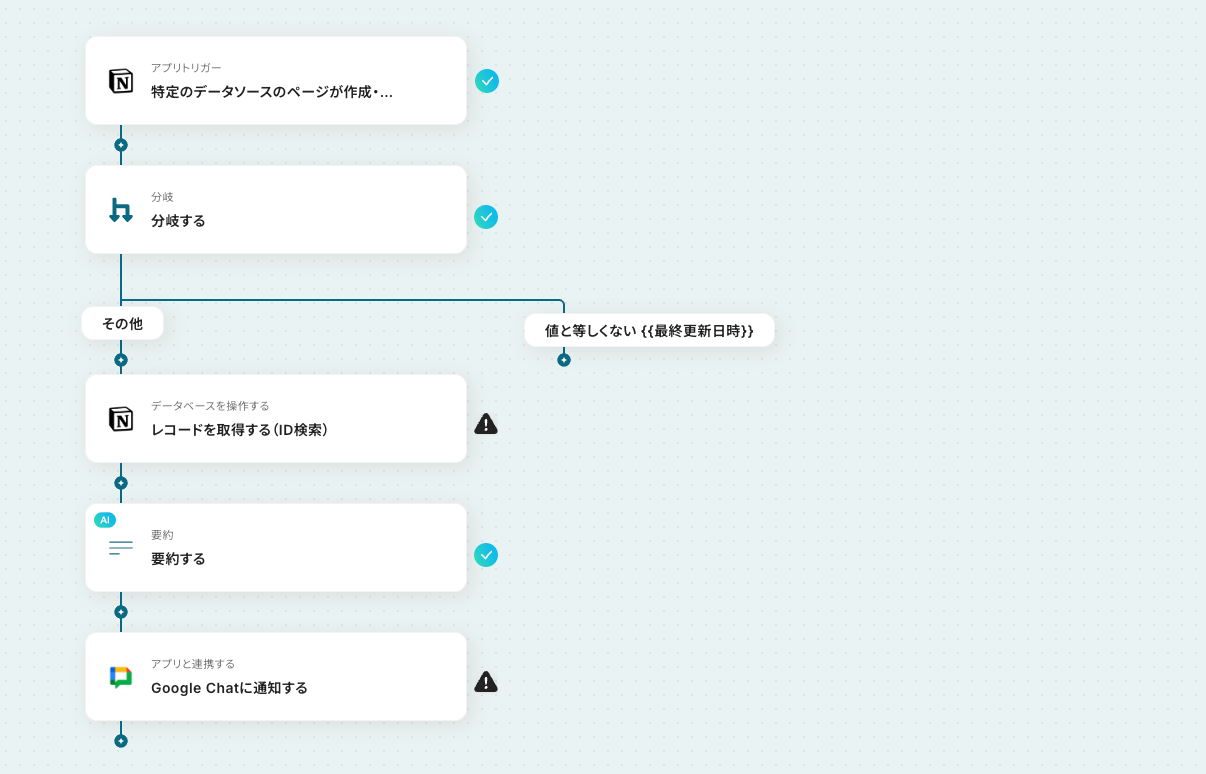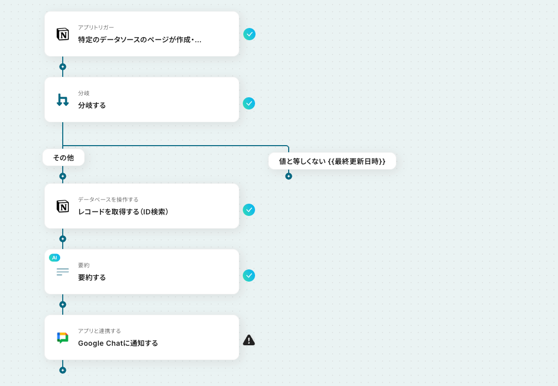 16)これで【Notionデータベースに登録された議事録の内容を要約してGoogle Chatに通知する】というフローの完成です。