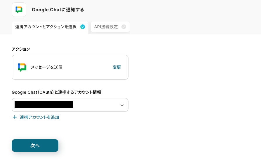 4)連携するアカウント情報の入力を確認して、「次へ」をクリックします。