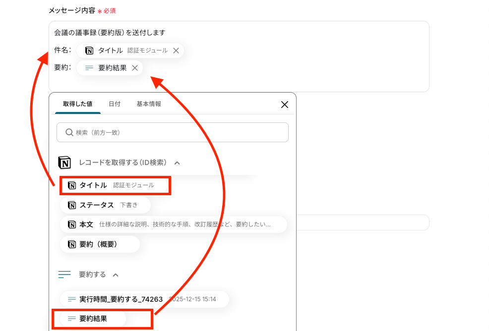 先に連携したNotionの情報を引用できるので、「ID」を候補から選択します。