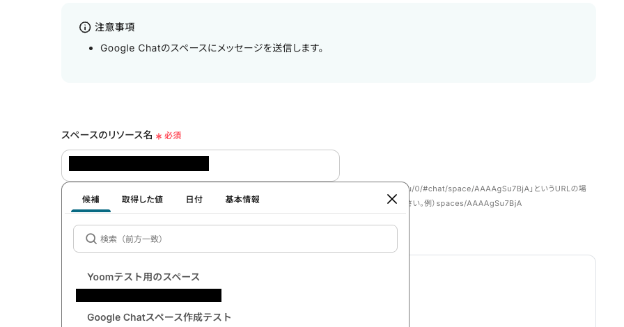 14)スペースのリソース名を候補から選択、もしくは直接入力してください。