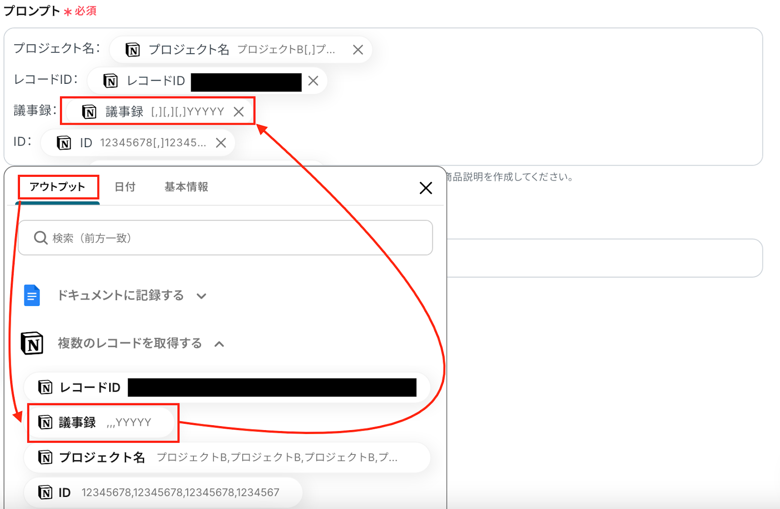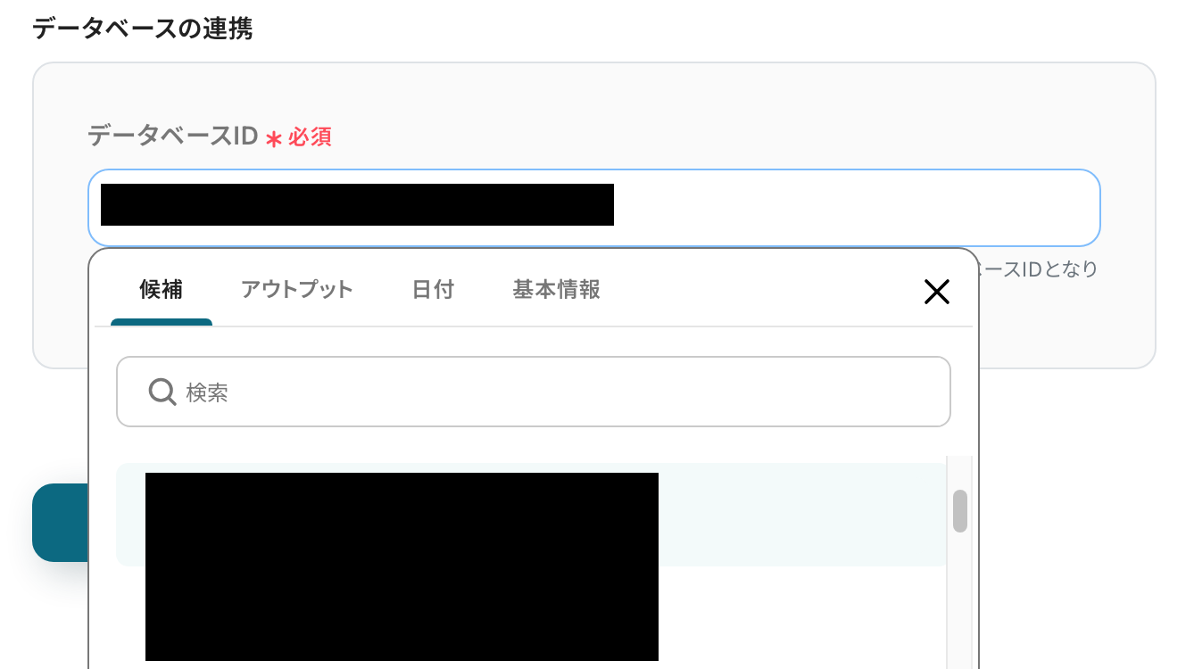 データベースIDはクリックすると連携しているアカウントから候補が表示されるので、その中から選択してください。