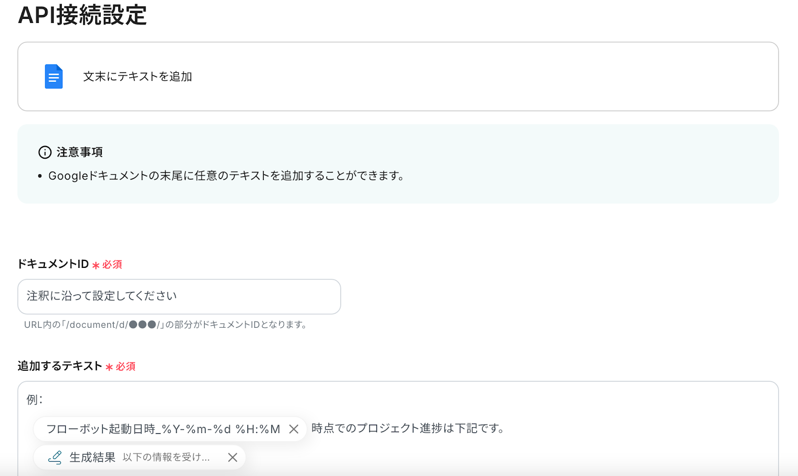 入力が完了したら「テスト」をクリックし、Googleドキュメントに正しく追加されていることを確認します。