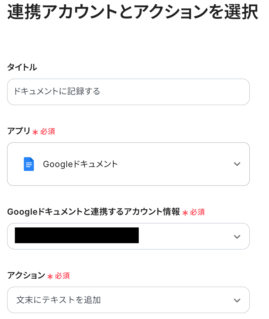 タイトルや実行アクションはデフォルトで設定されています。連携するアカウント情報が間違っていないか確認しましょう。