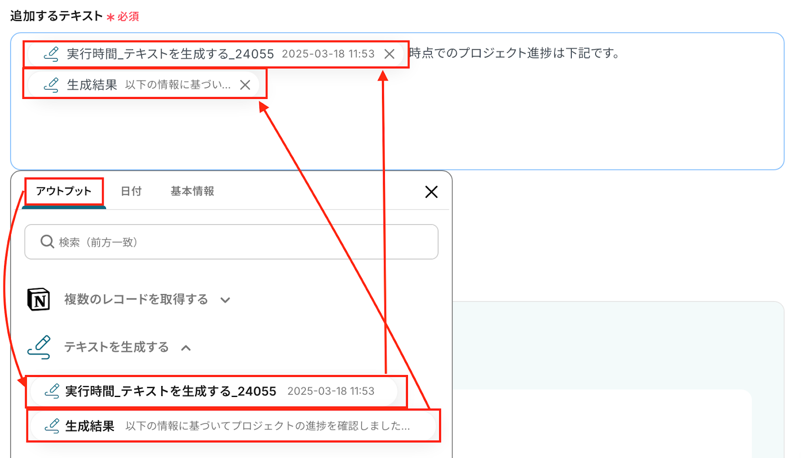 先ほど同様に、定型文と、「テキストを生成する」アクション設定で取得したアウトプットを活用して設定します。