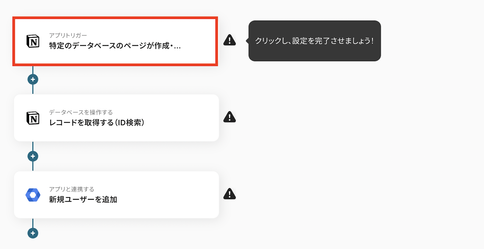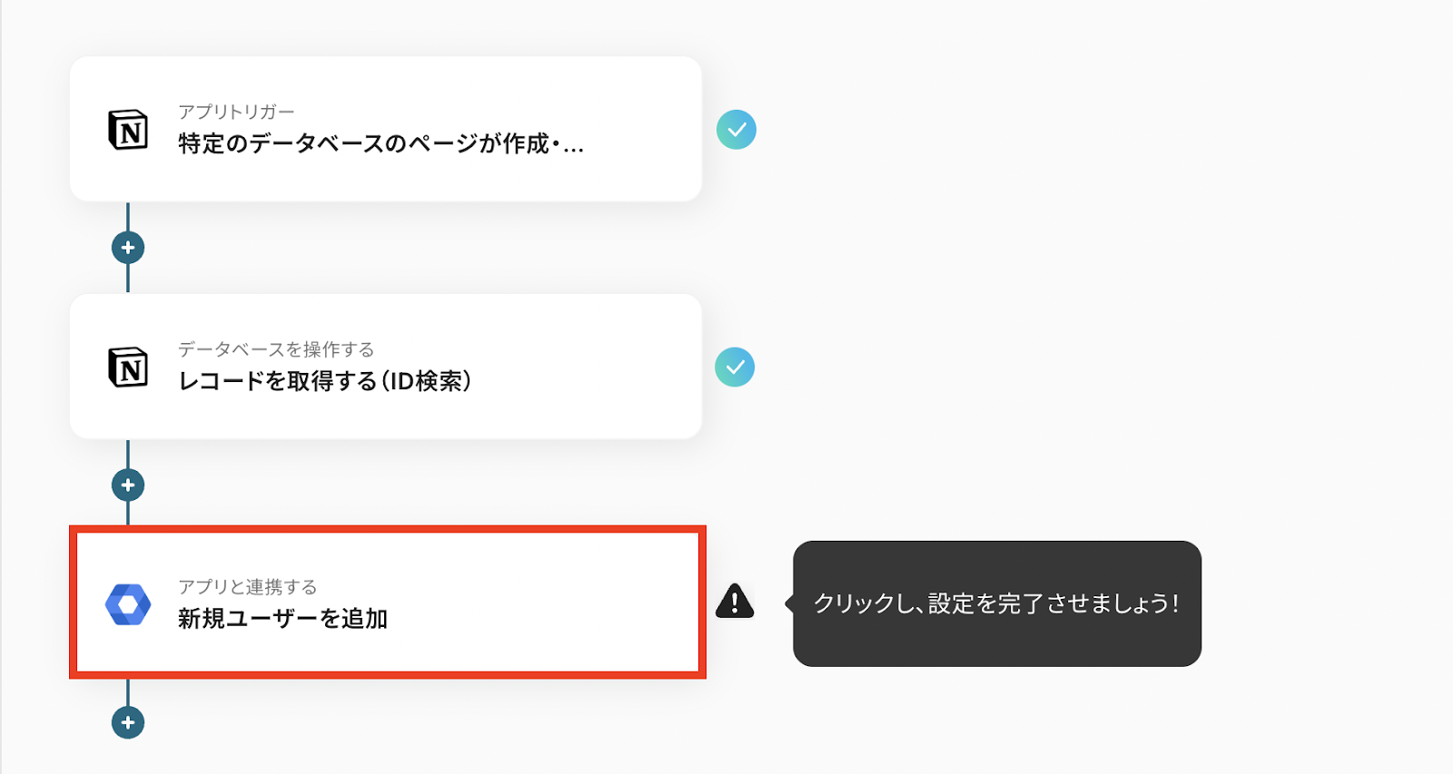 「Notionでページが作成されたら、Google Workspaceに新規ユーザーを追加する」ワークフローは、アカウント発行業務を自動化します。