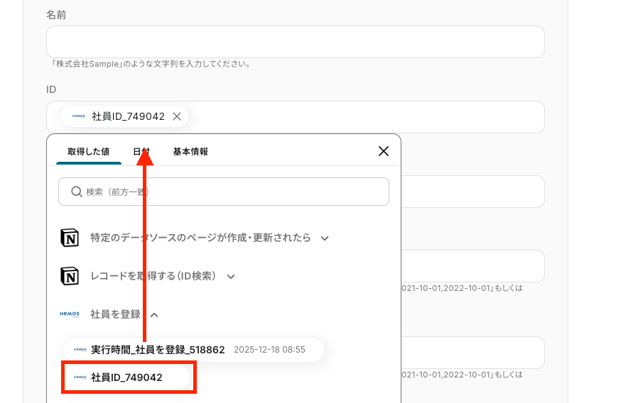 取得したいレコードの条件を、以下のように『取得した値』からIDを設定します。
