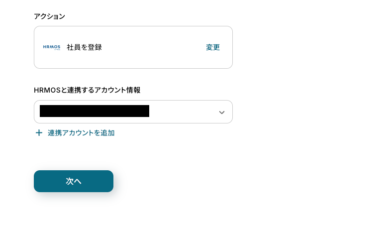 - 次に、オペレーションでHRMOSの「社員を登録」アクションを設定し、Notionから取得した情報を連携します