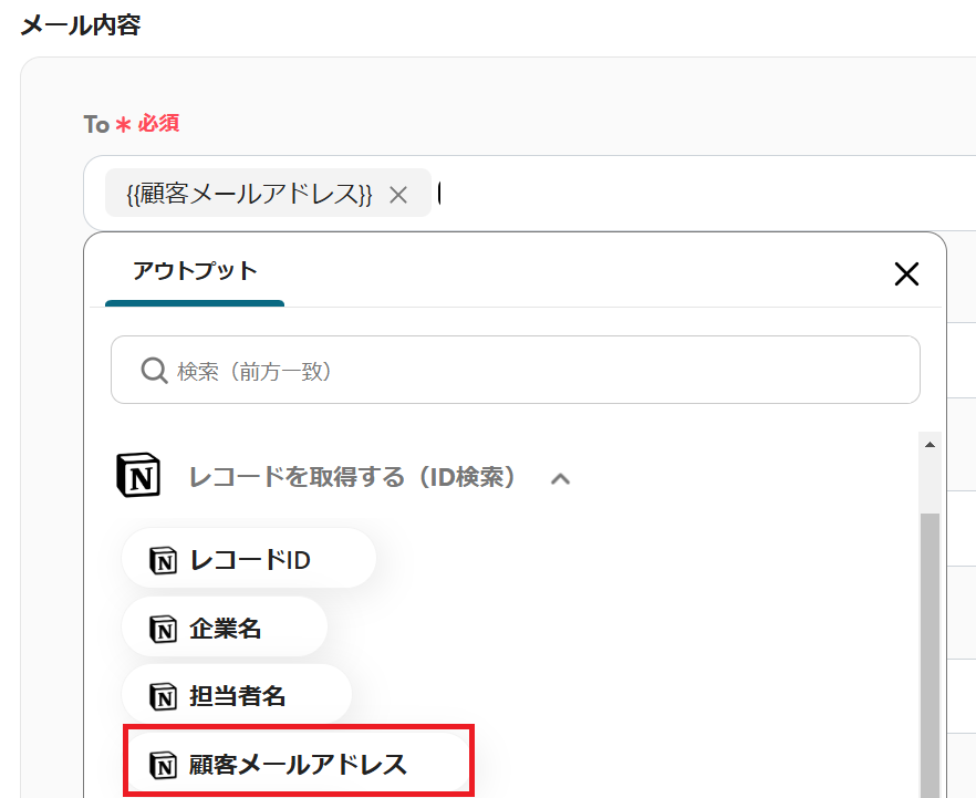 スクロールし、「メール内容」を設定します。 「To」→任意で設定 Notionのアウトプットを使用して設定してください。