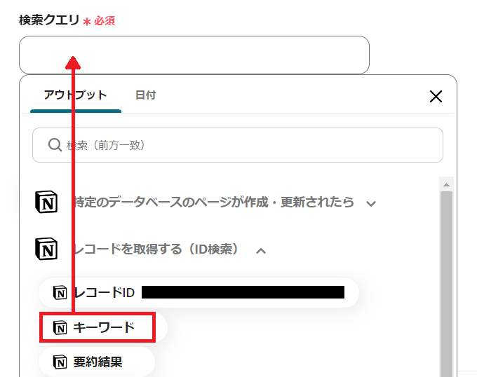 Notionのページデータが表示されます。「キーワード」をクリックし、ボックスに挿入してください。