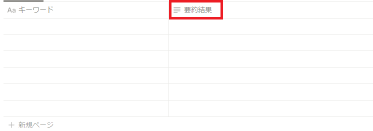 このNotionのページにある「キーワード」をもとに検索を行い、自動要約後、「要約結果」が更新されるため、この2つの項目は作成しましょう。