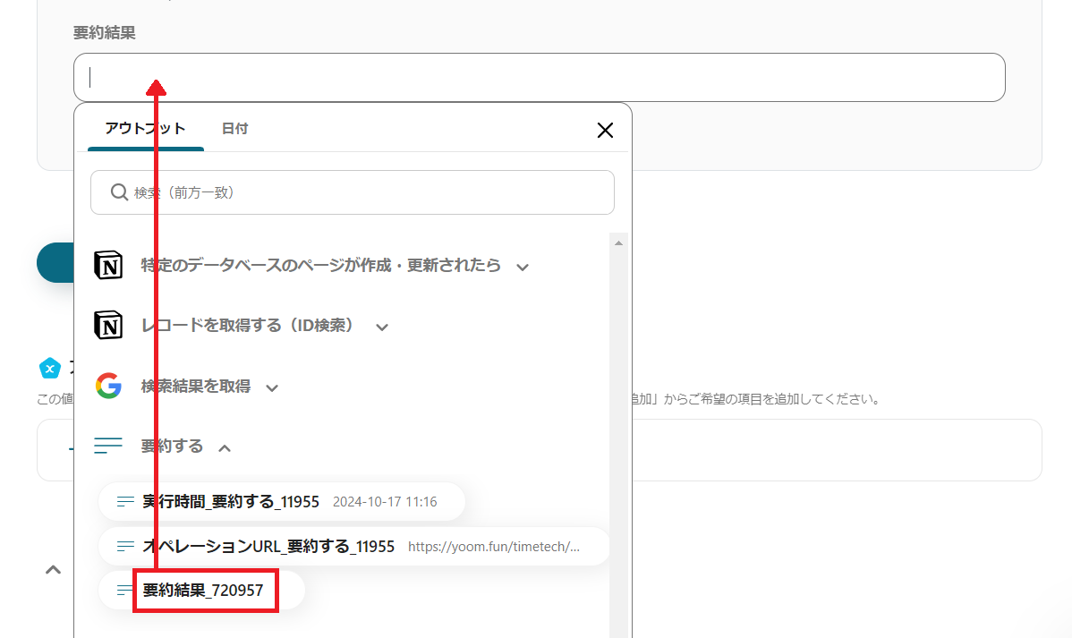 今回は「要約結果」というカラムを用意しているため、要約結果のボックスをクリックしましょう。
