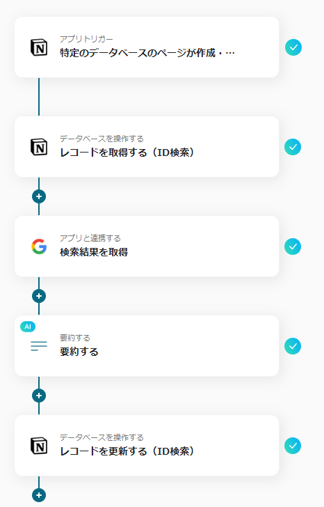 この連携により、Notionに追加したキーワードをもとに自動的にGoogle 検索を行い、その内容を自動要約可能になります。さらに要約した検索結果はNotionに追加されるため、リサーチ業務におけるフローが自動化されるでしょう。