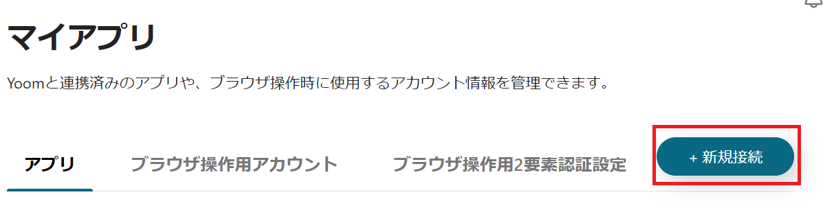 まずは、Yoomと各ツールの連携を行います。右上の「新規接続」をクリックしましょう。