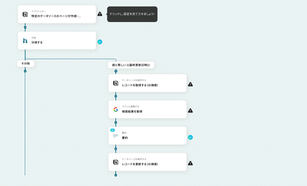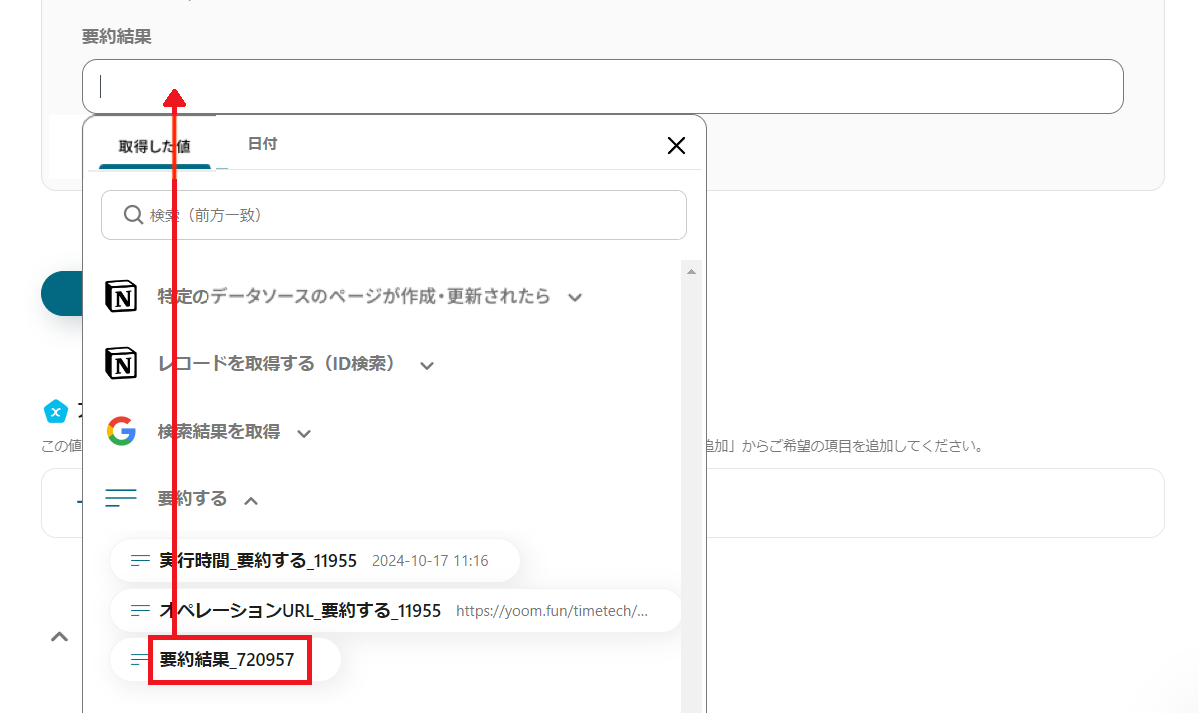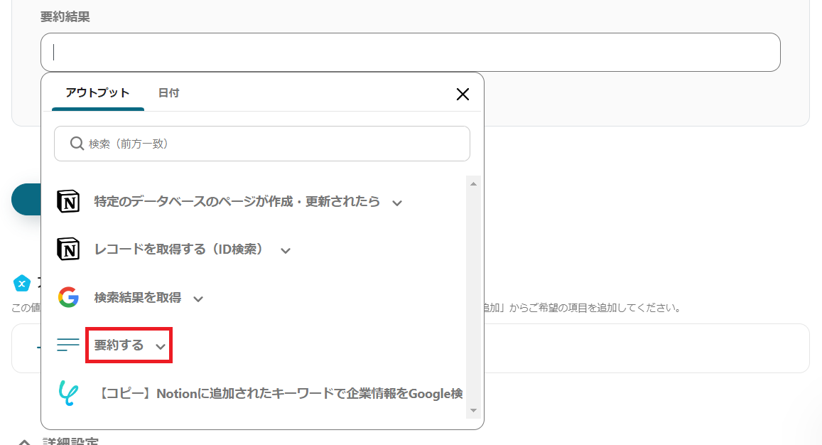 要約した検索結果をNotionのページに追加する設定を行います。こちらに関しても設定方法は先ほどと同じです。