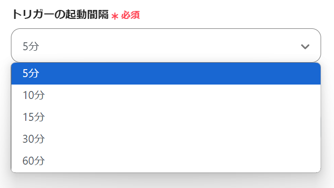 トリガーは5分、10分、15分、30分、60分の間隔で起動間隔を選択できます。プランによって最短の起動間隔が異なりますので、ご注意ください。