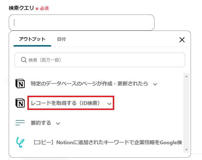 Notionのアイコンの「レコードを取得する(ID検索)」を選択してください。