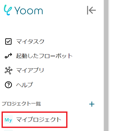 Yoomの「マイプロジェクト」というページに移行しているため、画面の左側にあるメニューから「マイアプリ」を選択してください。