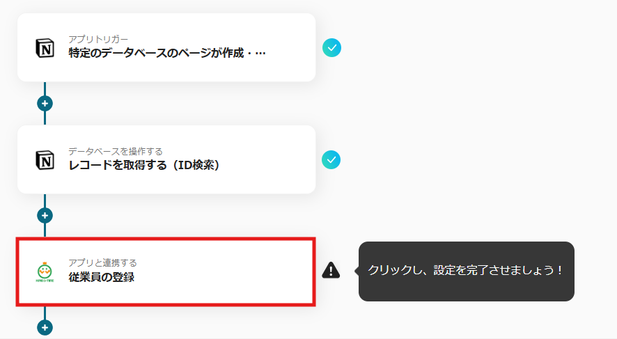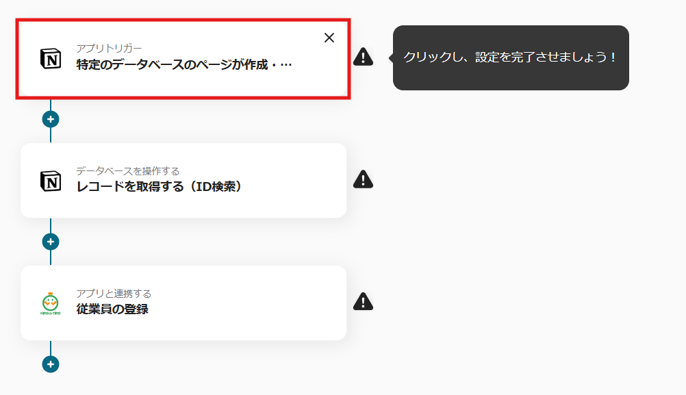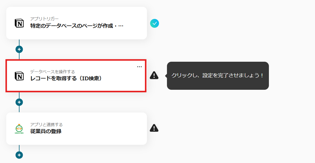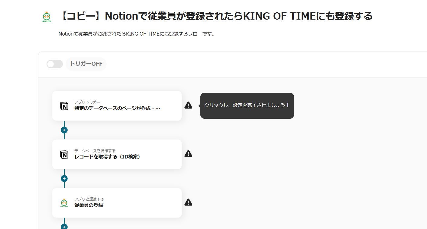 これで【Notionで従業員が登録されたらKING OF TIMEにも登録する】というフローが完成です。