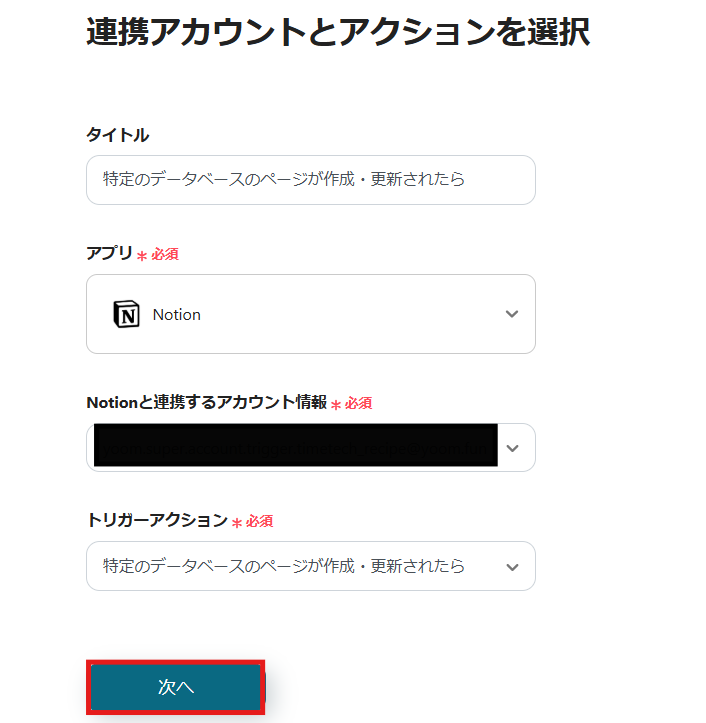 1) アクションは「特定のデータベースのページが作成・更新されたら」を選択して、「次へ」をクリックします。