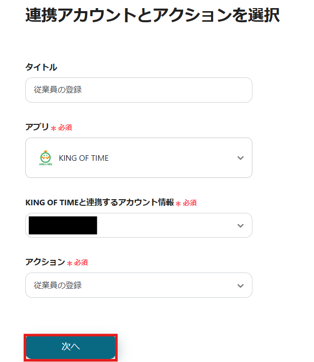 2) アクションは「従業員の登録」を選択し、「次へ」をクリックします。