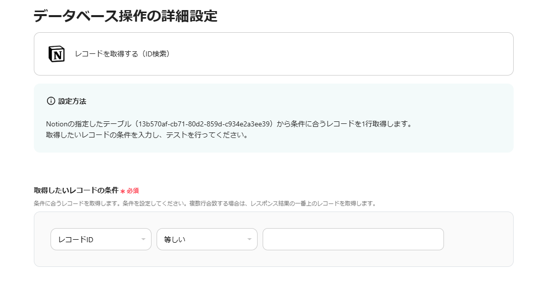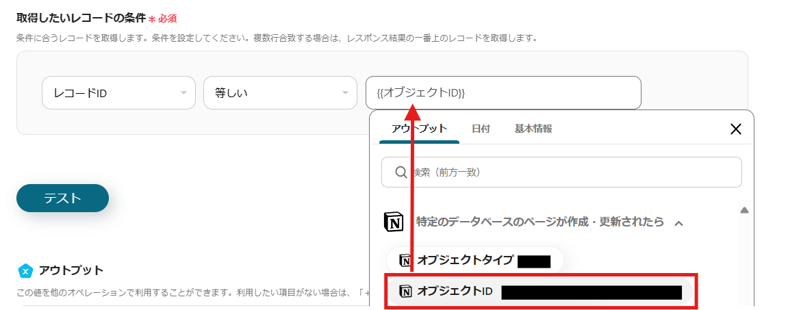 取得したいレコードの条件は「レコードID 等しい {{オブジェクトID}} 」とします。