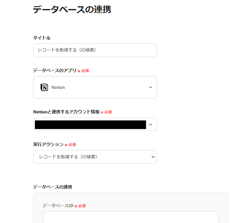 2) アクションは「レコードを取得する(ID検索)」を選択してデータベースIDを入力し、「次へ」をクリックします。
