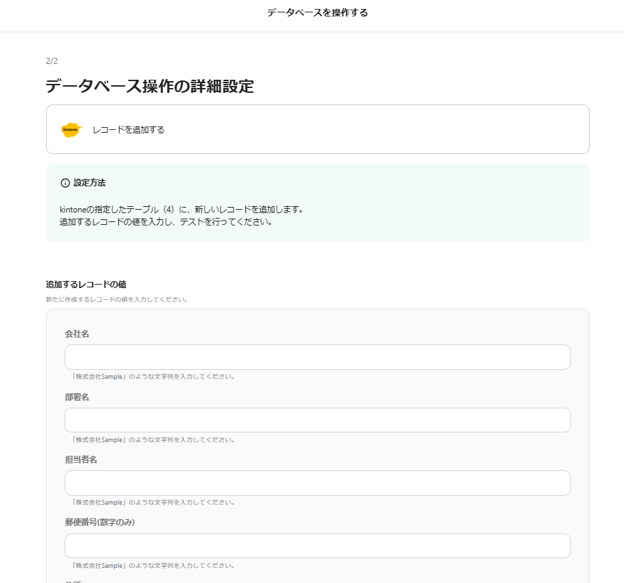 - kintoneにレコードを追加する際は、OCRで取得した情報や固定値を、kintoneアプリのどのフィールドに登録するかを自由に設定できます。