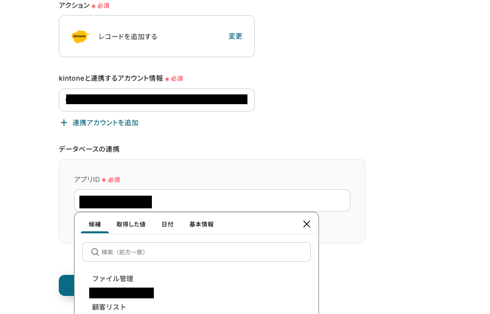 - kintoneにレコードを追加するアクションで、データを追加したいアプリや、OCRで読み取った情報をどのフィールドに登録するかを任意で設定してください。