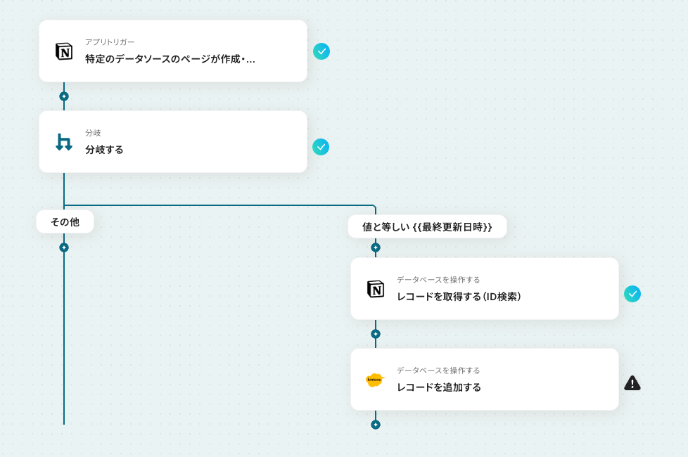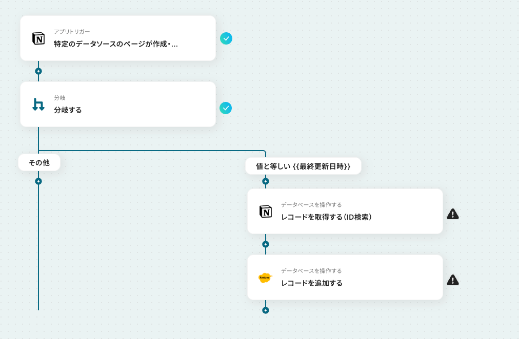 これで【Notionの任意のデータソースに情報が追加されたら、kintoneにも追加する】というフローの完成です。