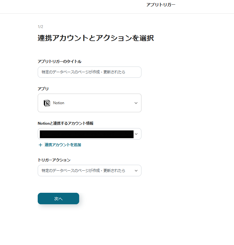 4.トリガーアクションは「特定のデータベースのページが作成・更新されたら」を選択して、「次へ」をクリックします。
