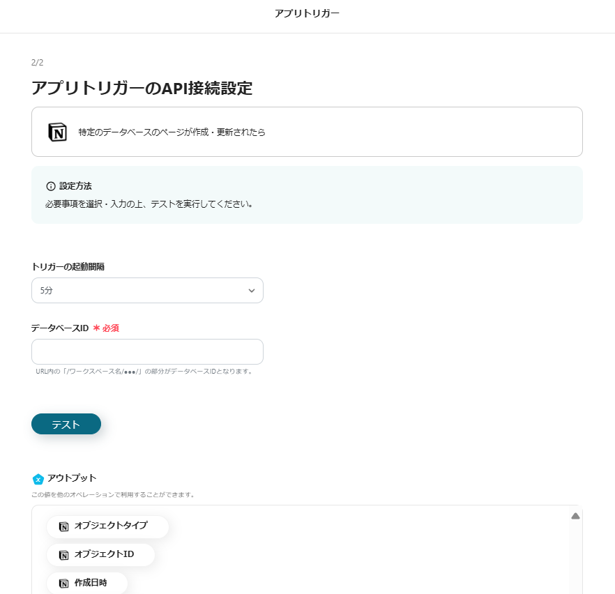 5.トリガーの起動間隔を選択して、「データベースID」を入力します。