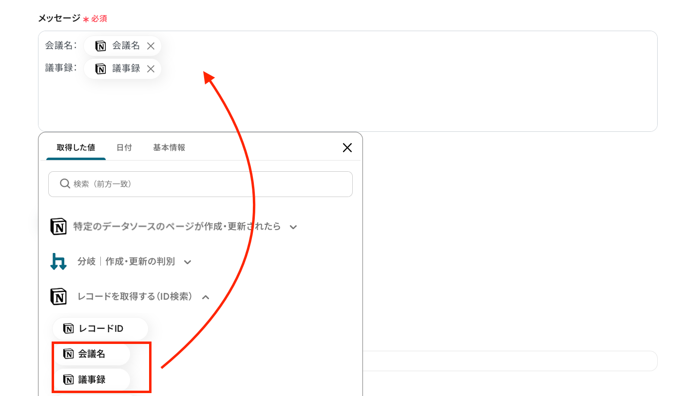 - Notionでレコードを取得する際、検索のキーとなる項目や値は、固定値だけでなく前段のオペレーションで取得した情報を変数として設定することも可能です。