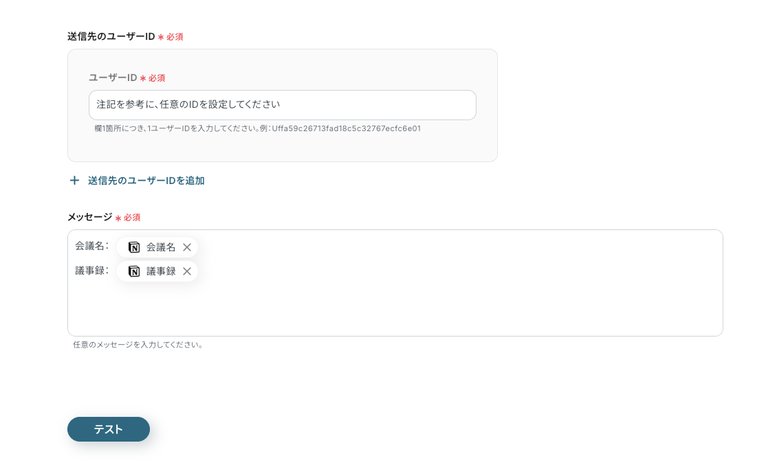 - LINE公式アカウントでの通知アクションでは、通知先を任意で設定できるほか、メッセージ本文に固定のテキストだけでなく、Notionから取得した動的な情報を変数として埋め込むことが可能です。