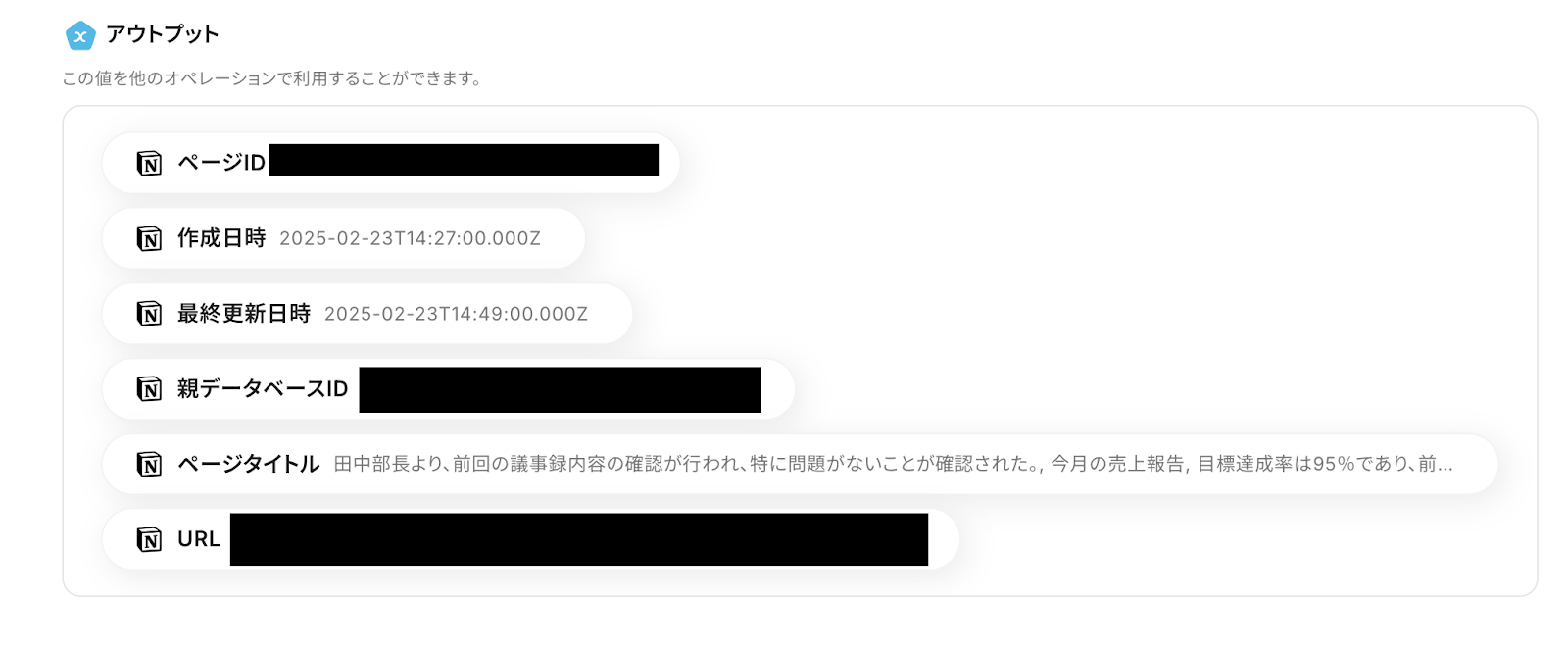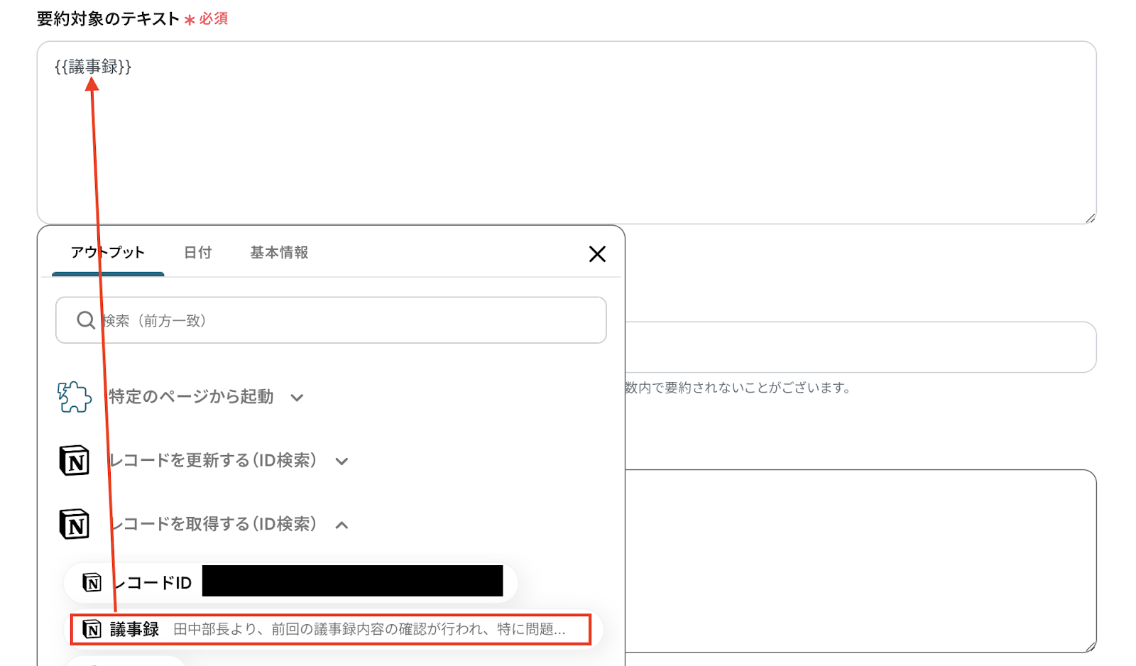 要約対処のテキストへ、Notionのアウトプットから要約したい文章の「議事録」の項目を選択します。