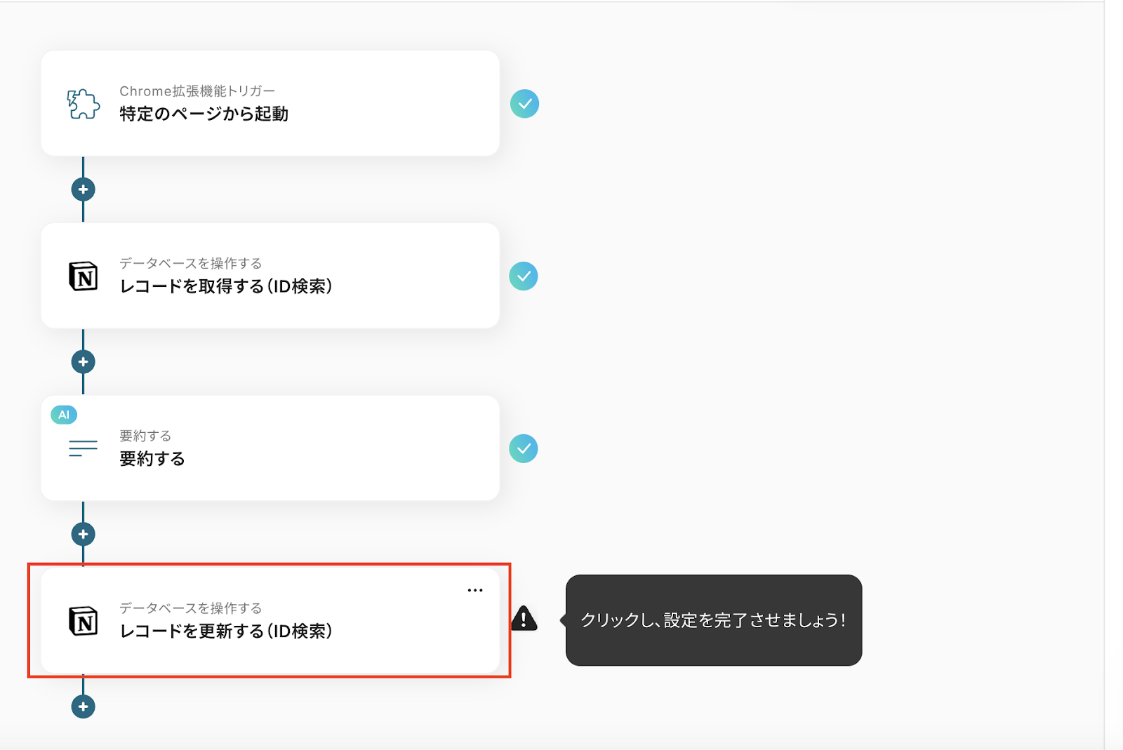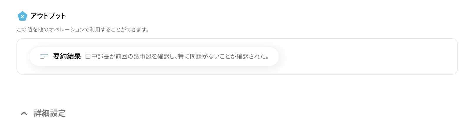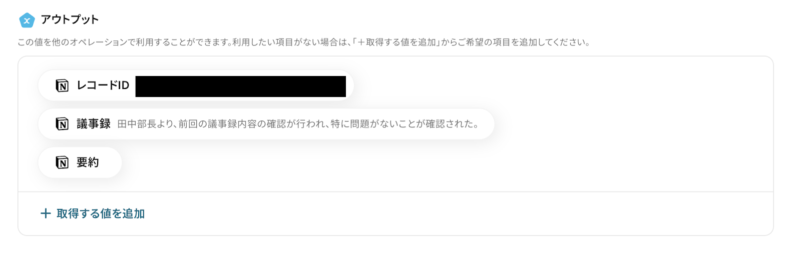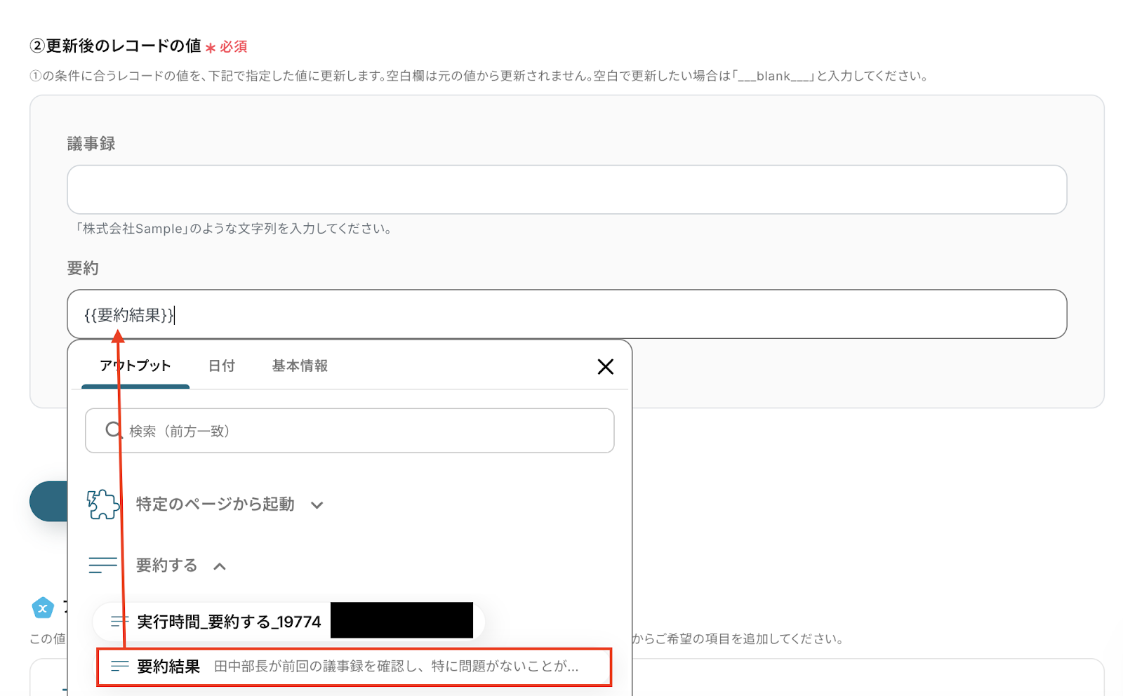 更新後のレコードの値の「要約」の項目に、アウトプットから「要約結果」を選択しましょう。