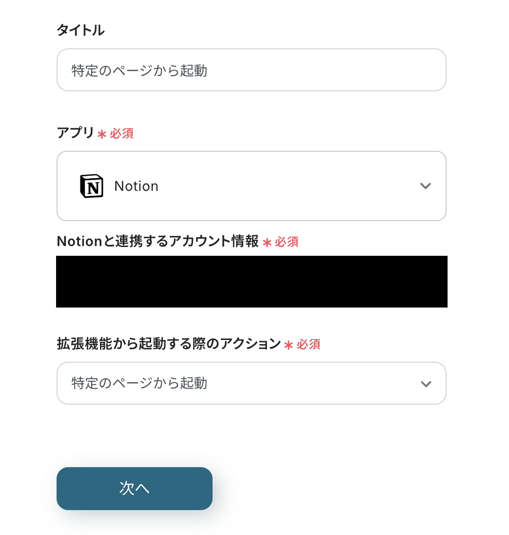 連携アカウントとアクションを選択画面は、事前に設定済みですので、「次へ」をクリックしてください。