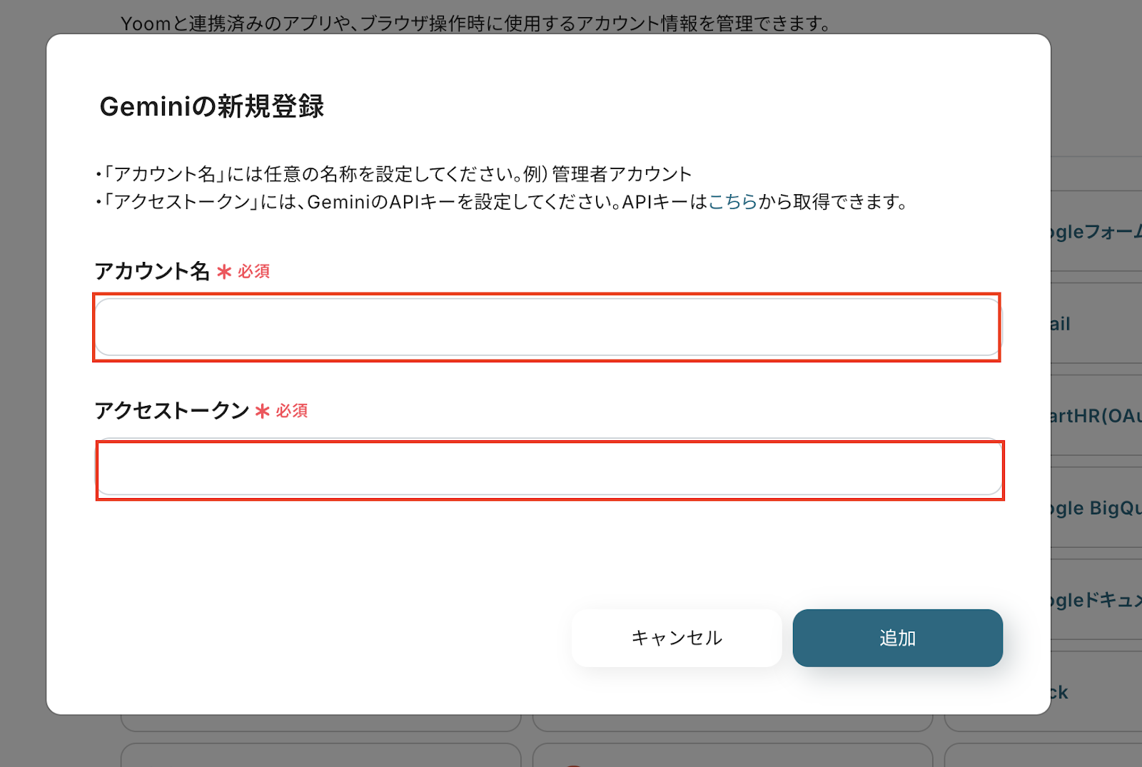 Yoomからマイアプリ→新規接続→Geiminiの順で選択してください。