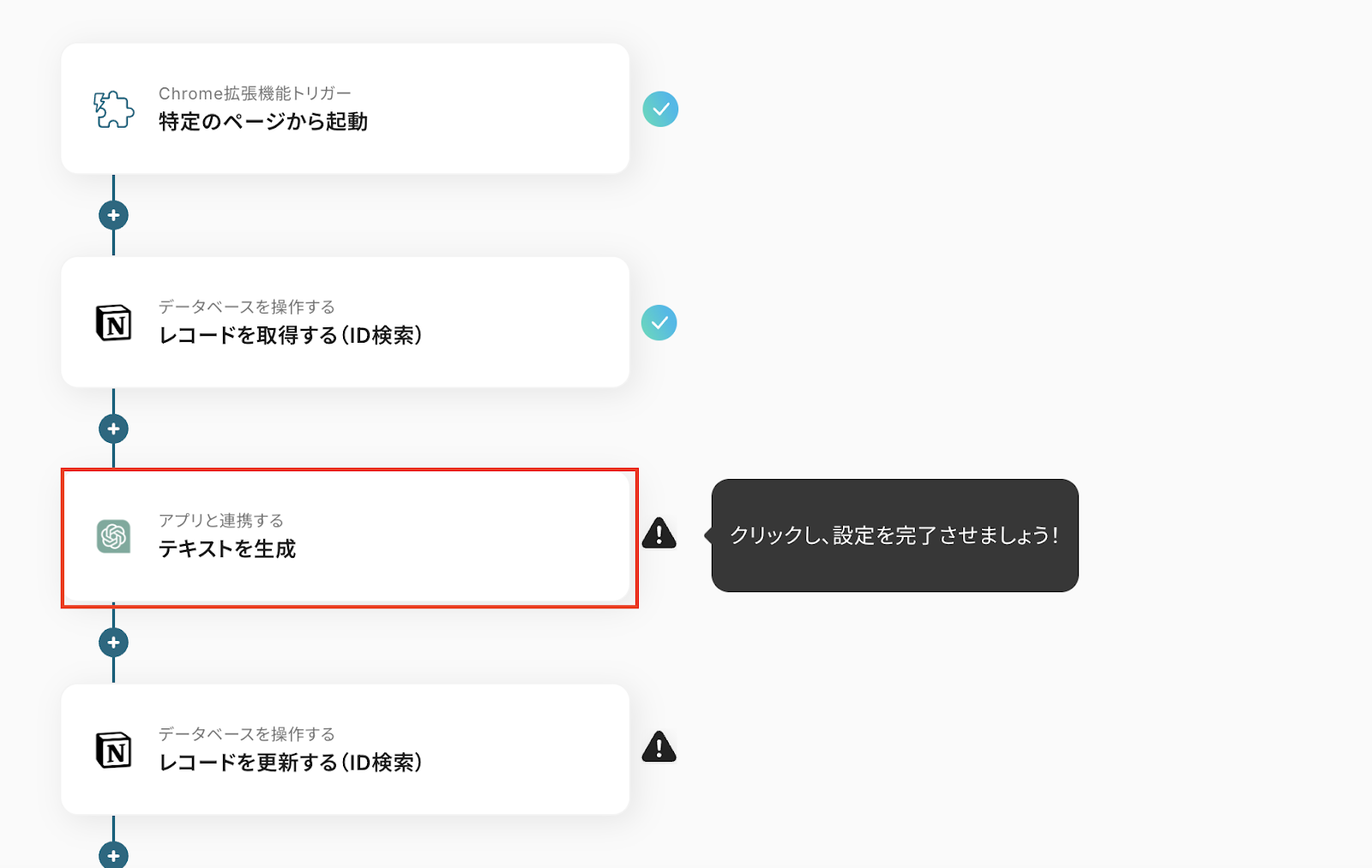 Notionのトリガーやアクション設定は1つ目と同様ですので、ここでは ChatGPTのアクション設定を解説します。