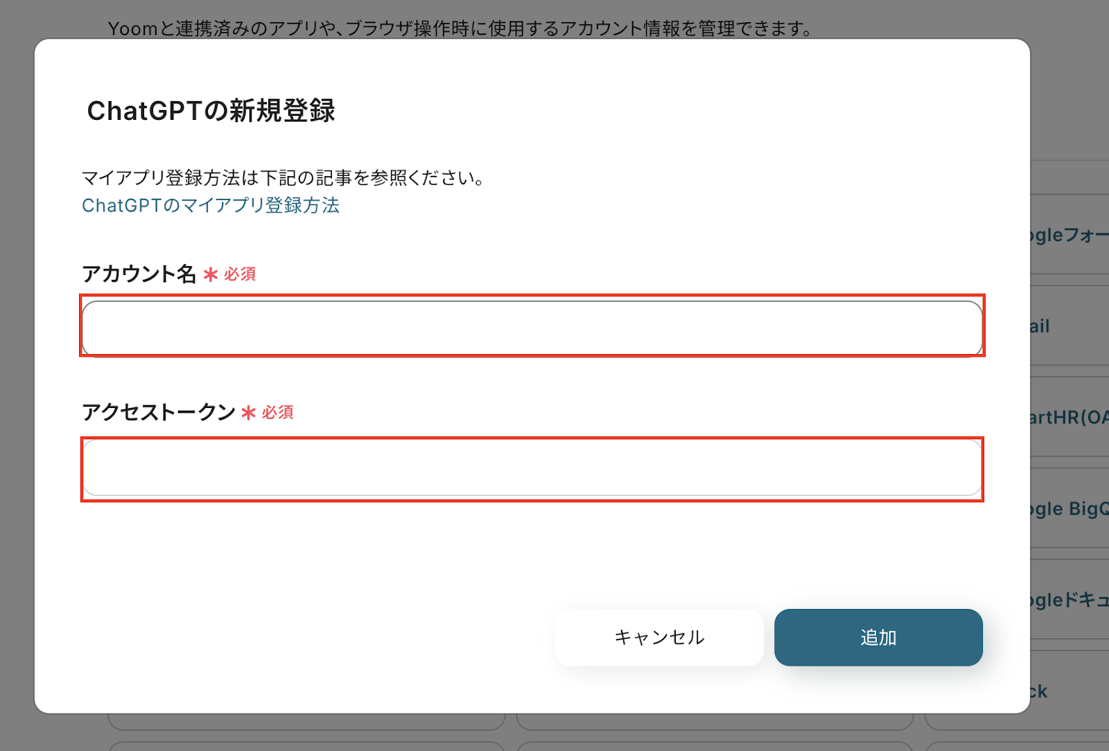 Yoomからマイアプリ→新規接続→ChatGPTの順でクリックしましょう。