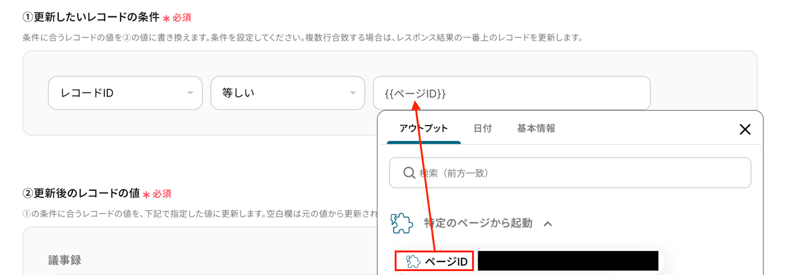 更新したいレコードの条件を添付画像のようにアウトプットから選択しましょう。