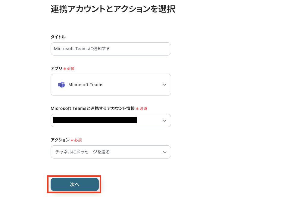 連携するアカウント情報が入力されていることを確認して、[次へ]をクリックします。